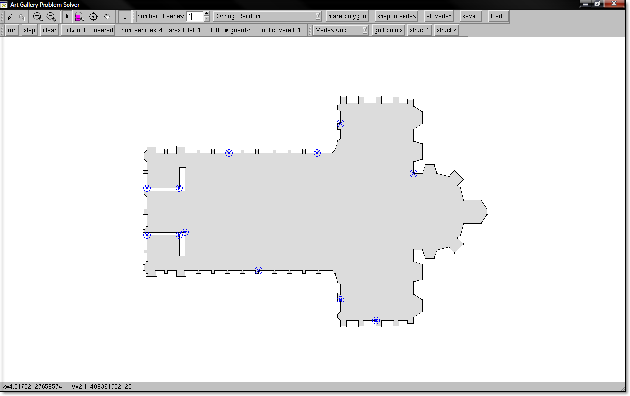 - [1] An Exact Algorithm for an Art Gallery Problem, M. C. Couto, P. J. de Rezende and C. C. de Souza, 2009, Technical Report 2009-46 (pdf, bib, abstract). Submitted for publication.